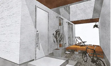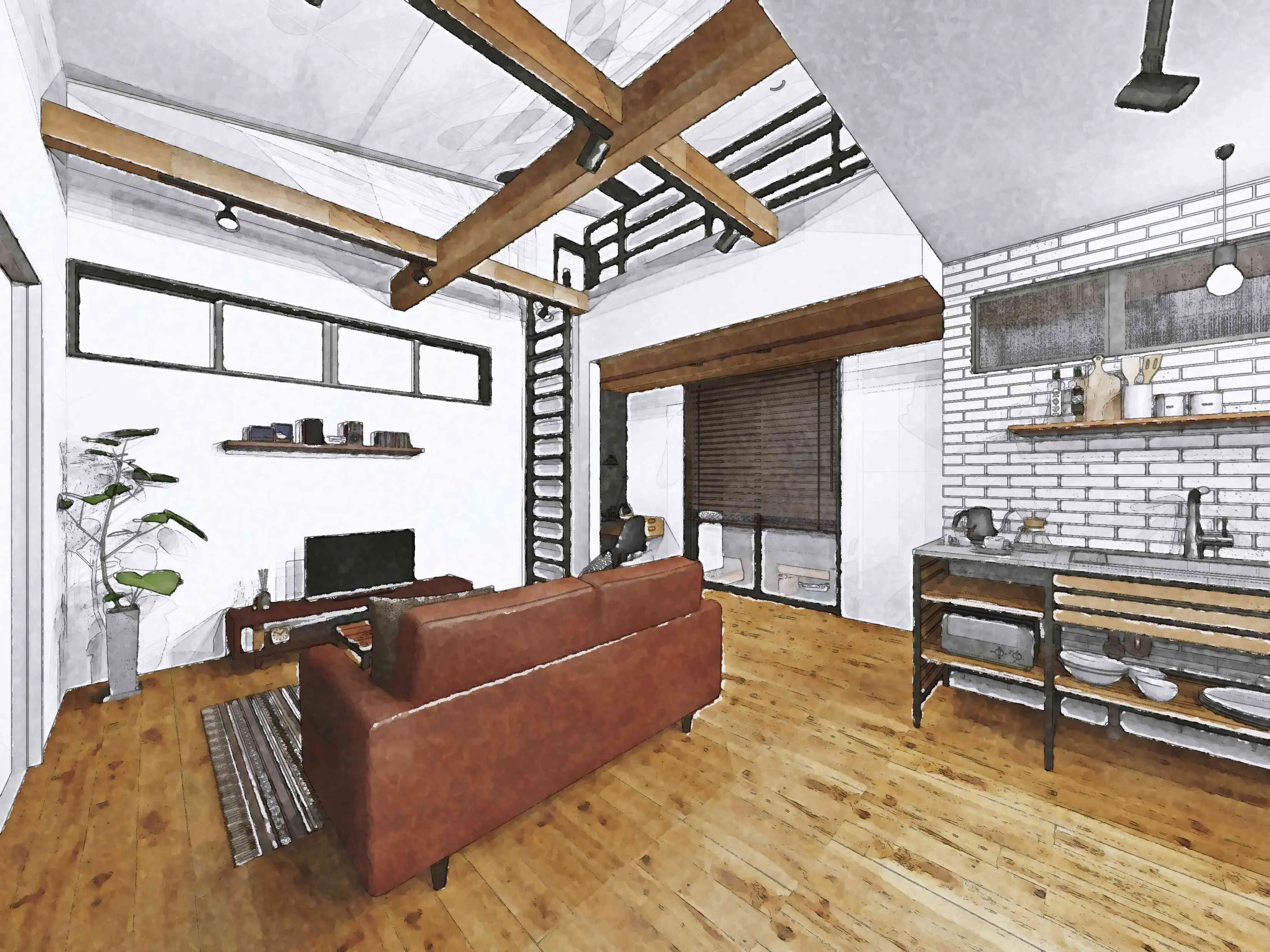インダストリアルスタイルの内観パースのVRはお問合せください。