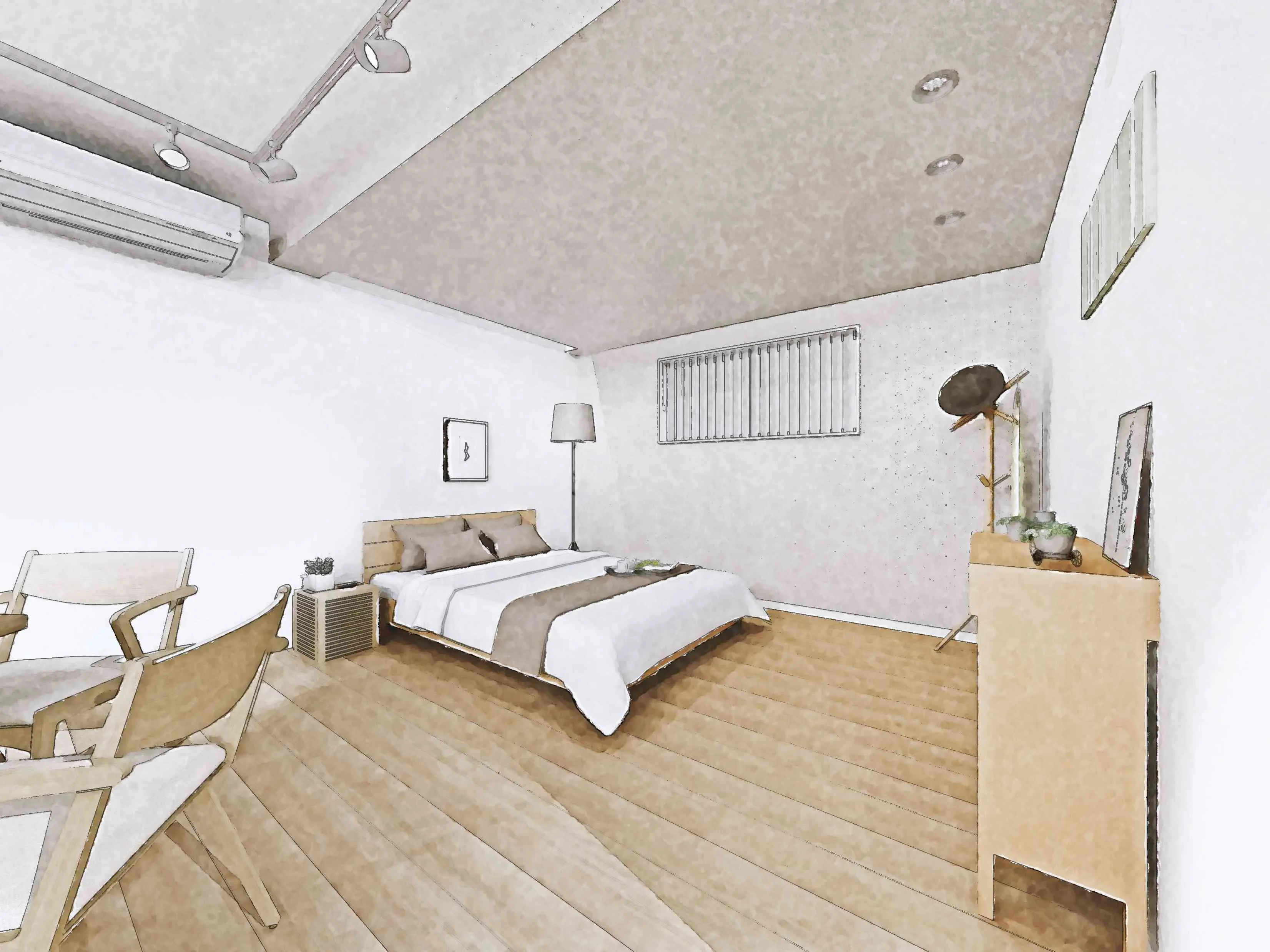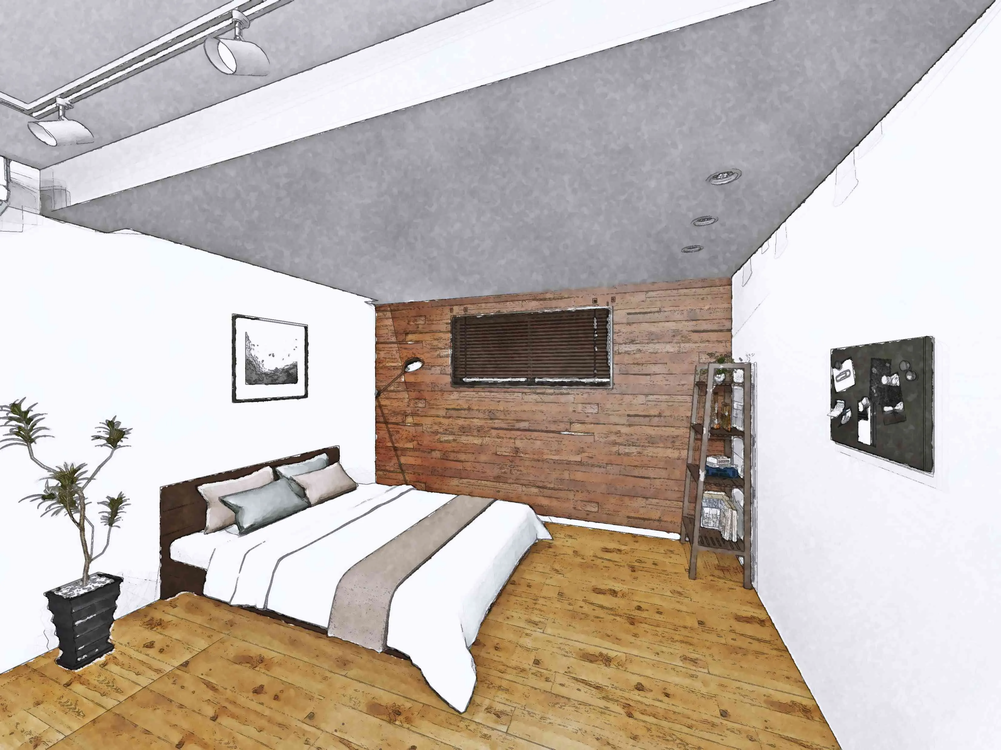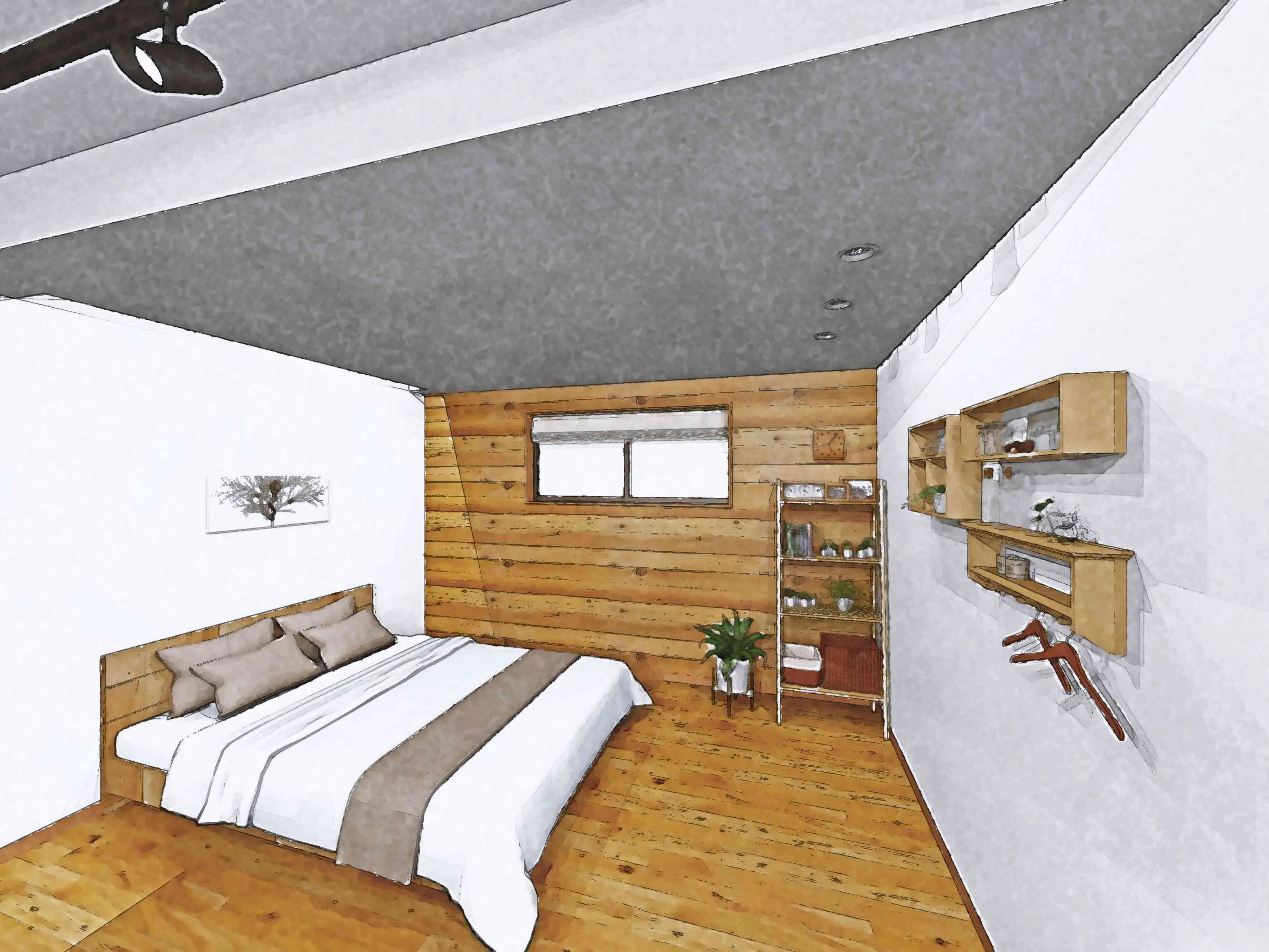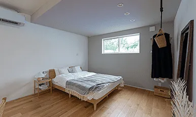 6帖分のベッドスペースを用意。ベッド正面の壁はDIYで付け足す収納壁として活用いただけます。何らかのパーテーションを足す事も想定しベッド近くにエアコンを設置できるようにしました。