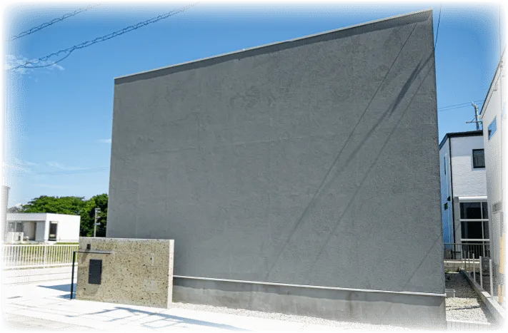 ファサードとなる大きな壁は、あくまでも住む本人達の見せたいもの、こだわる部分を大切にしたいためのアクセント。更には建物正面に視界を絶つことで、敷地外の景観は気にしなくて良い造りとなっています。
