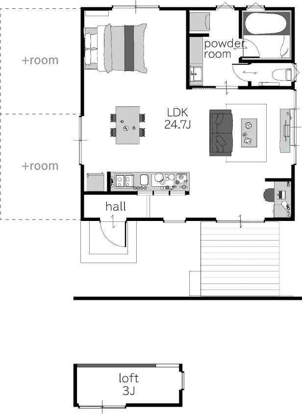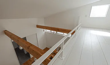 玄関とキッチンの仕切りは室内窓を設置することで、視界と明るさを繋げることを実現。ワンルームで必要最低限の間仕切りのみで構成しています。これが究極のゼロLDK。ワンルーム内の使い方は基本的にフリーでリビング下の空間は書斎や趣味の空間として活用して頂けます。またウッドデッキをつければその空間から、お庭も室内感覚で使える仕上げになっています。リビング上は勾配天井とし、ロフトも設置。このロフトは繋がりを多く持たせる位置関係を実現しています。