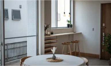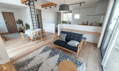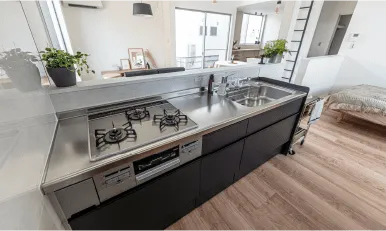 キッチン前にカウンターを配置。ワークスペース・家事・スタディコーナー多用途に使えますが、ライフスタイルにより食事用カウンターとする事でLDKの動線や空間によりゆとりが生まれ、ダイニングテーブル等が不要となります。