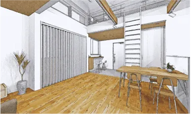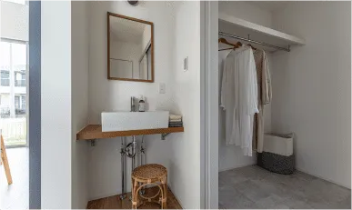 土間のゲストルームとしての使用や、外とのつながりを持たせた空間を前提に腰壁を用意。プラスの仕切りとして梁からタペストリーを吊るす事も可能です。