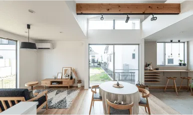 外部とのつながりをオープンに設定。より多くの光を室内に採り込みます。玄関ポーチの屋根となる部分が3方オープンなバルコニーとなります。
