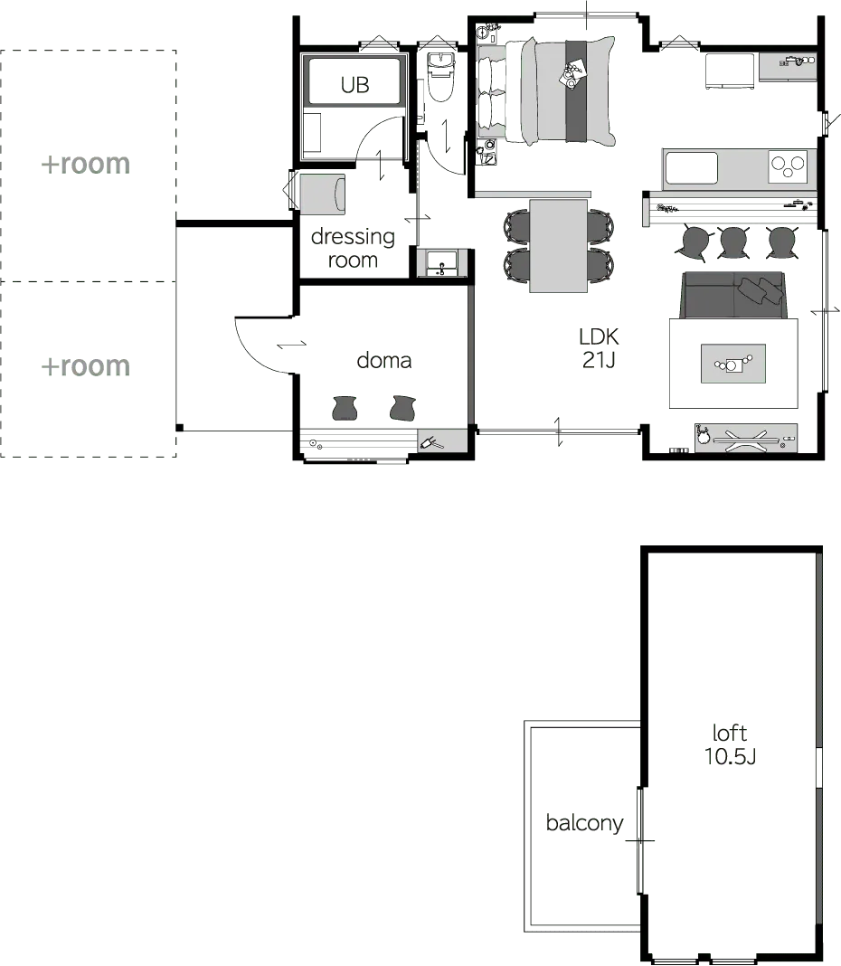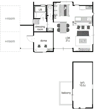 部屋の増室箇所が特徴的なプラン。屋根はあるが玄関ポーチを挟んでの動線となっており離れのような感覚です。ダイニングやベッドスペースを勾配天井とし、隣接する水回り・ゲストルーム上にはロフト10帖を設置し上下のつながりをもたせました。