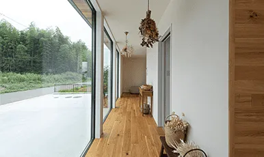 LDKが小道のようになっており常に奥行きを感じられます。同時に大きな窓や室内窓を多数配置したことにより開放感を演出。