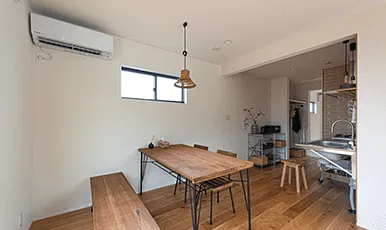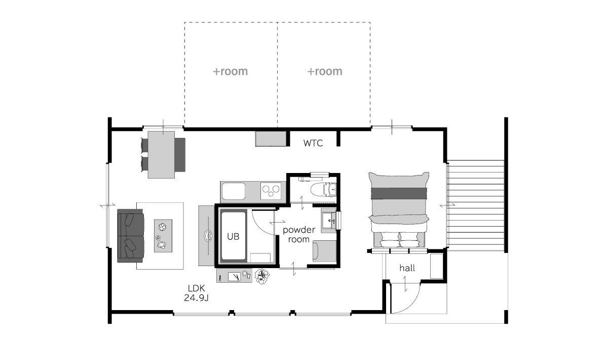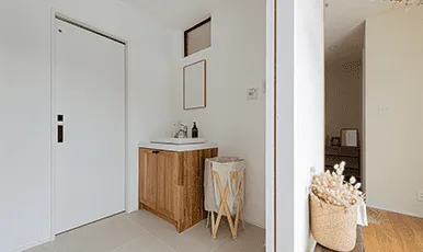 水回りを囲う壁や入り口となるドアを外観デザインとまとめてコーディネートしつつDIYで付け足せるスペースを確保しました。
