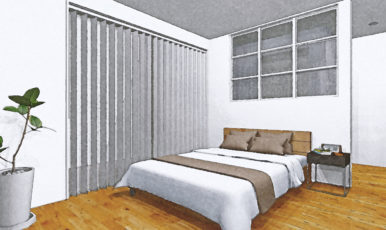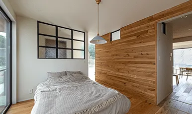 玄関と室内窓で隔てられたベッドスペース。中庭とつながるような空間に仕上げました。周囲から明るさは採り込み、視線はさえぎる間取りとなっています。