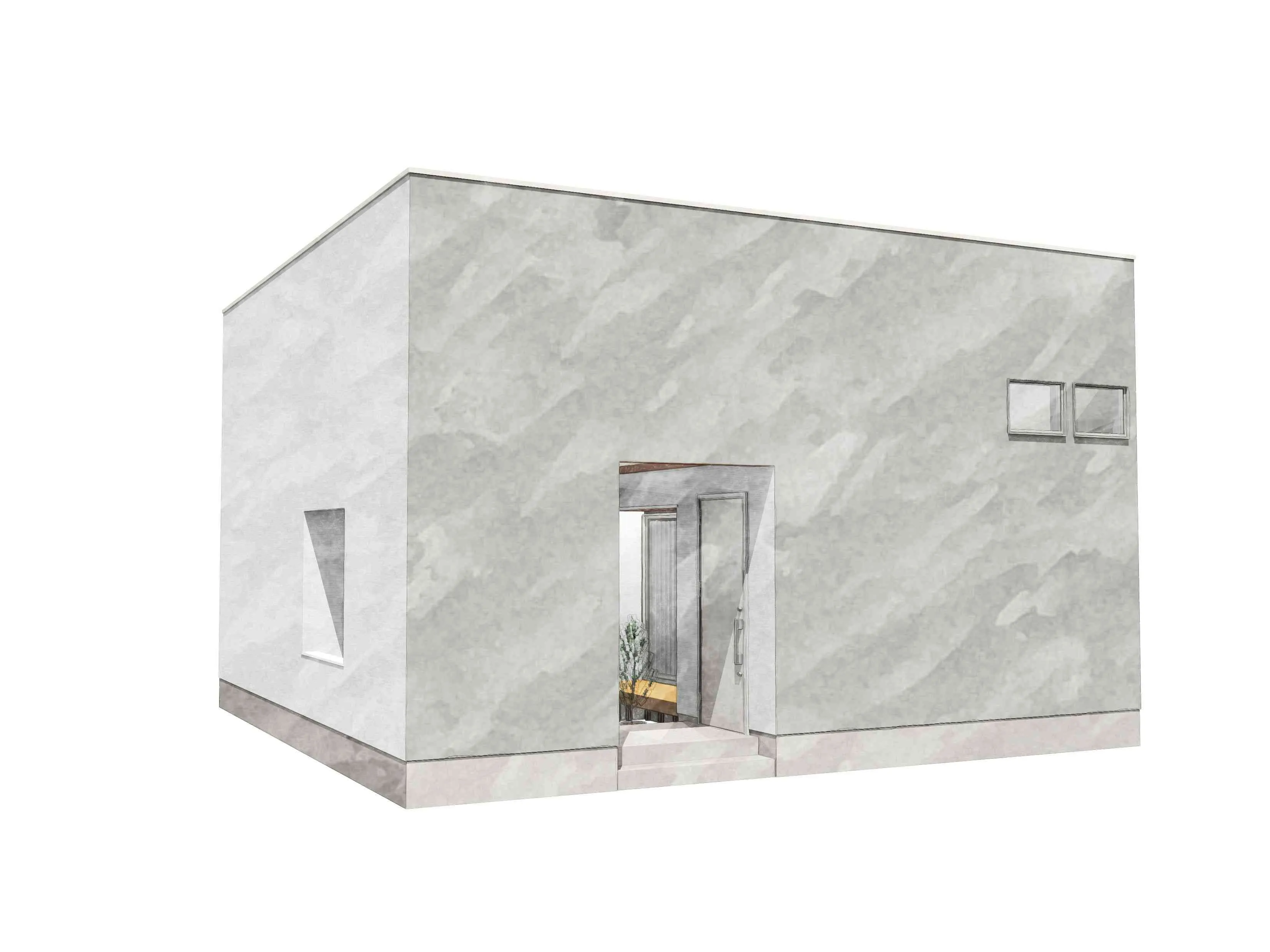 土地の状況に応じファサードとなる面を選択できる正方形のプラン。玄関ポーチ上の空きスペースは駐輪場としても活用できます。また来客用のベンチの設置位置としても望ましい位置になっています。更に中庭には入り口以外にも開口を設け、風や光を採りいれます。