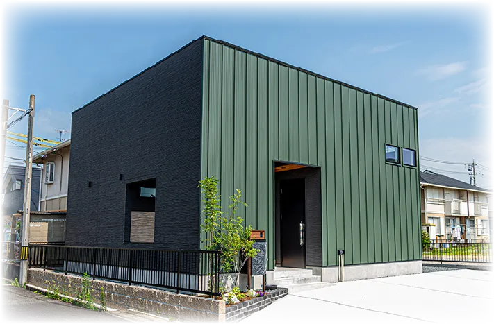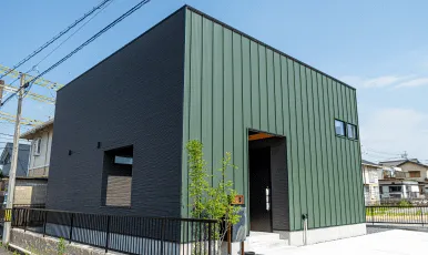 外観イメージ。モスグリーンのガルバリウム鋼板を使用。