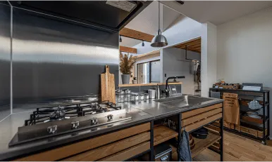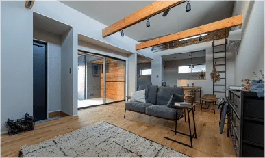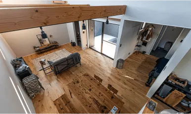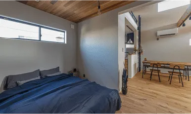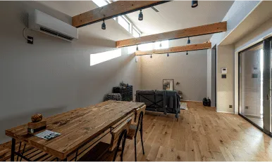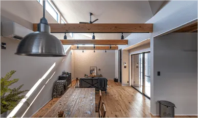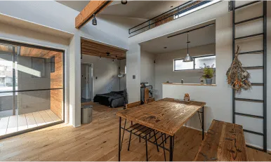 勾配天井とロフトで上下のつながりと奥行きのアクセントを演出。