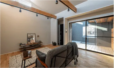 南面の壁はDIYにて収納等を付け足していく事を前提にハイサイドライトのみを広く設置。ディスプレイのイメージで見せる収納にする事で完全オリジナルな好きなものに囲まれたリビングが完成します。一日の時間の中でハイサイドライトが照らす梁や中庭への陽の射し方によりリビングの表情が大きく変わります。