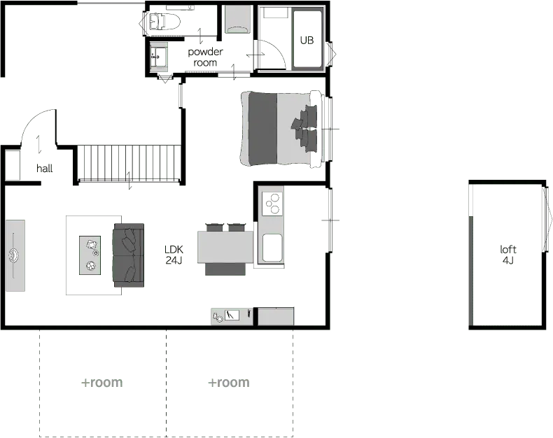 生活感の出やすいベッドと水回りとキッチンを図面上右側にまとめました。