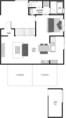 雨樋が囲われた壁内で納まり、外側への景観に影響が出ない事も工夫の1つです。床面積は16坪台に抑え、無駄は極力削っています。LD上は勾配天井とし、隣接するキッチン上にはロフトも設置し上下の繋がりをもたせています。そのロフトからのみ、LD上部に設置したハイサイドライドからの水平に見える景色を眺望できる特殊な空間が広がります。