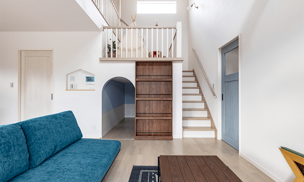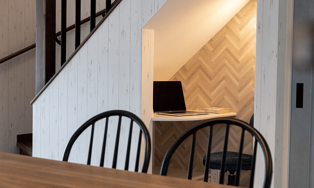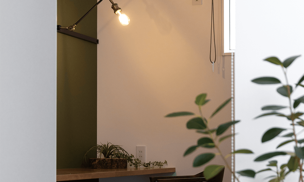 視線が切り替わるため、リビングとつながりながらも独立したスペースとして使えます。プラモデル制作やテレワーク、楽器演奏のスペースとして使われるケースが多いです。