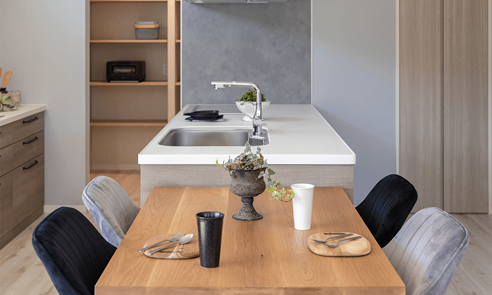 I型キッチンとダイニングテーブルを横並びに配置することで、空間を効率よく使えます。配膳や片付けがしやすく、コンパクトな間取りでも動線がスムーズです。