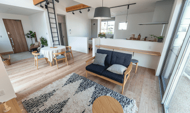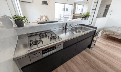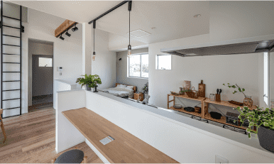 キッチン前にカウンターを配置。ワークスペース・家事・スタディコーナー多用途に使えますが、ライフスタイルにより食事用カウンターとする事でLDKの動線や空間によりゆとりが生まれ、ダイニングテーブル等が不要となります。