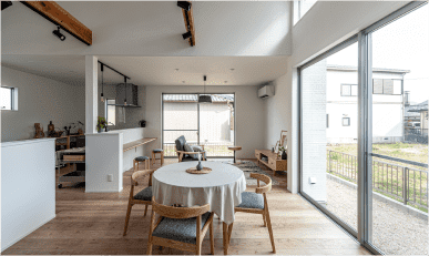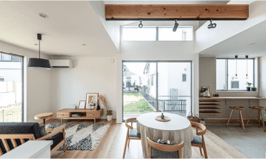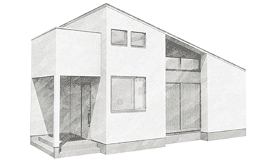 外部とのつながりをオープンに設定。より多くの光を室内に採り込みます。玄関ポーチの屋根となる部分が3方オープンなバルコニーとなります。