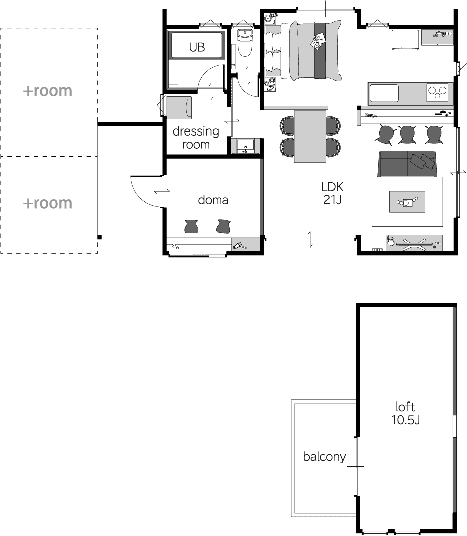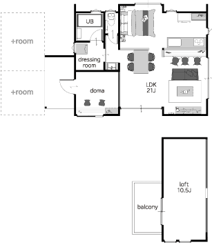 部屋の増室箇所が特徴的なプラン。屋根はあるが玄関ポーチを挟んでの動線となっており離れのような感覚です。ダイニングやベッドスペースを勾配天井とし、隣接する水回り・ゲストルーム上にはロフト10帖を設置し上下のつながりをもたせました。