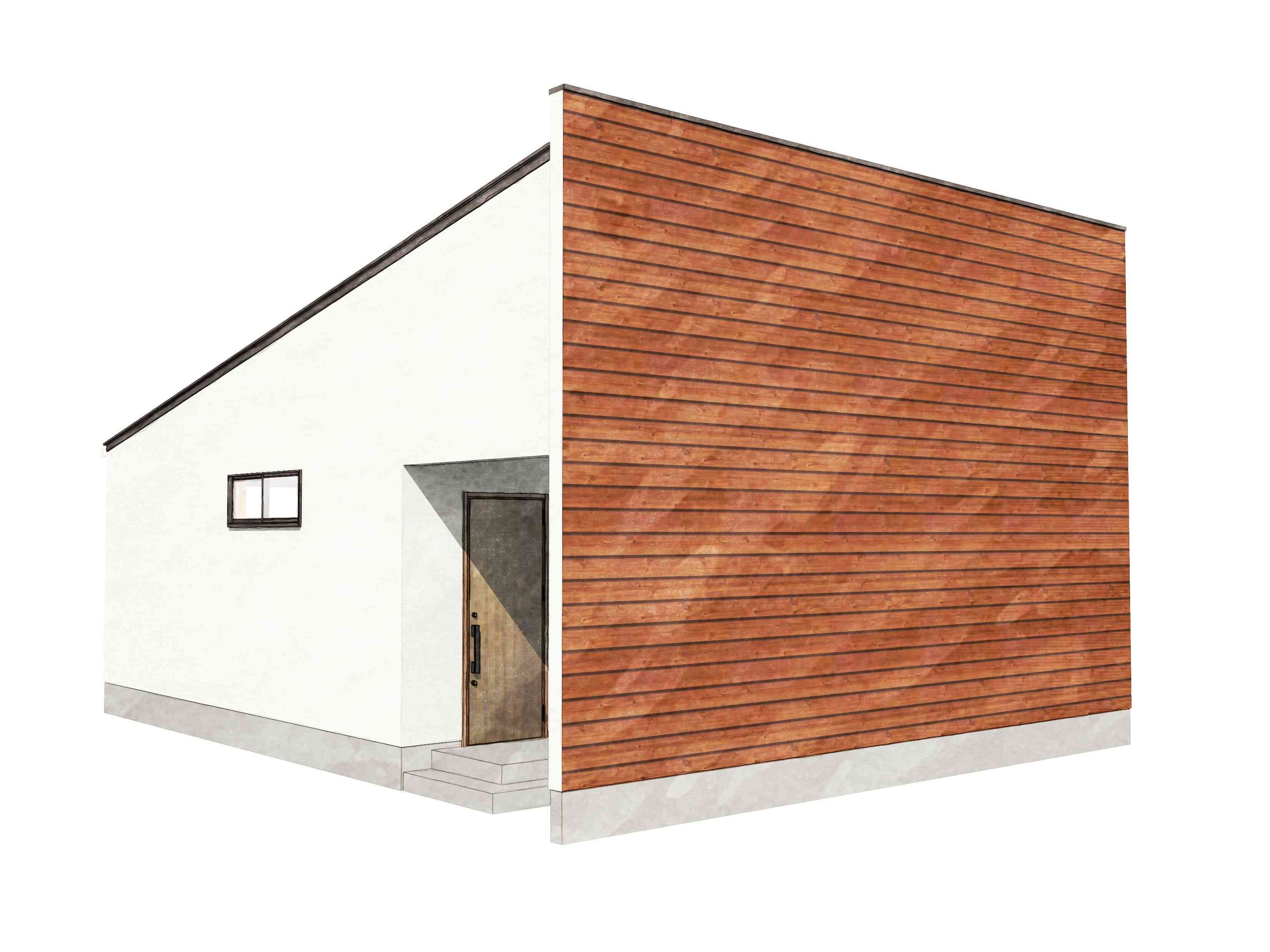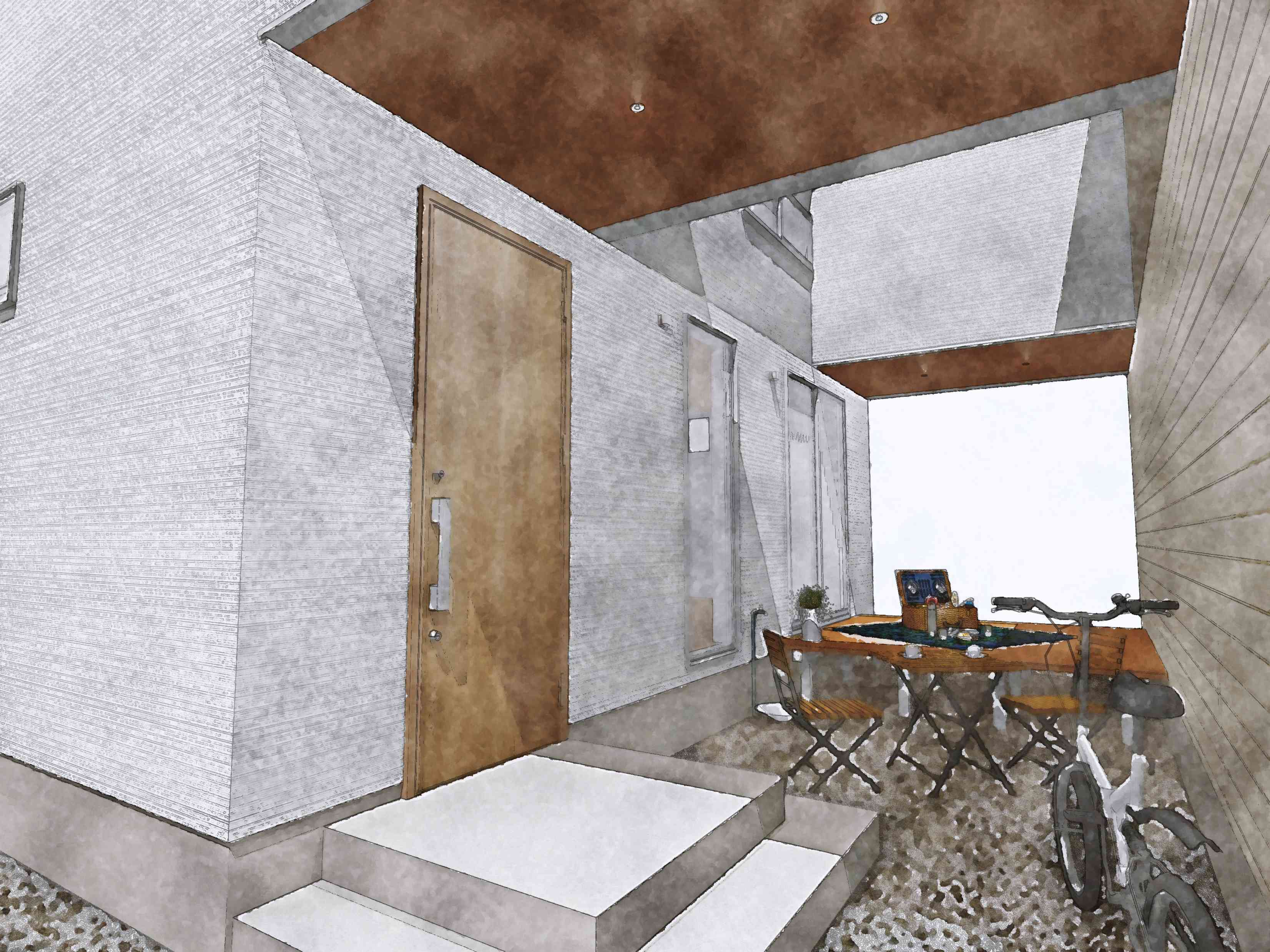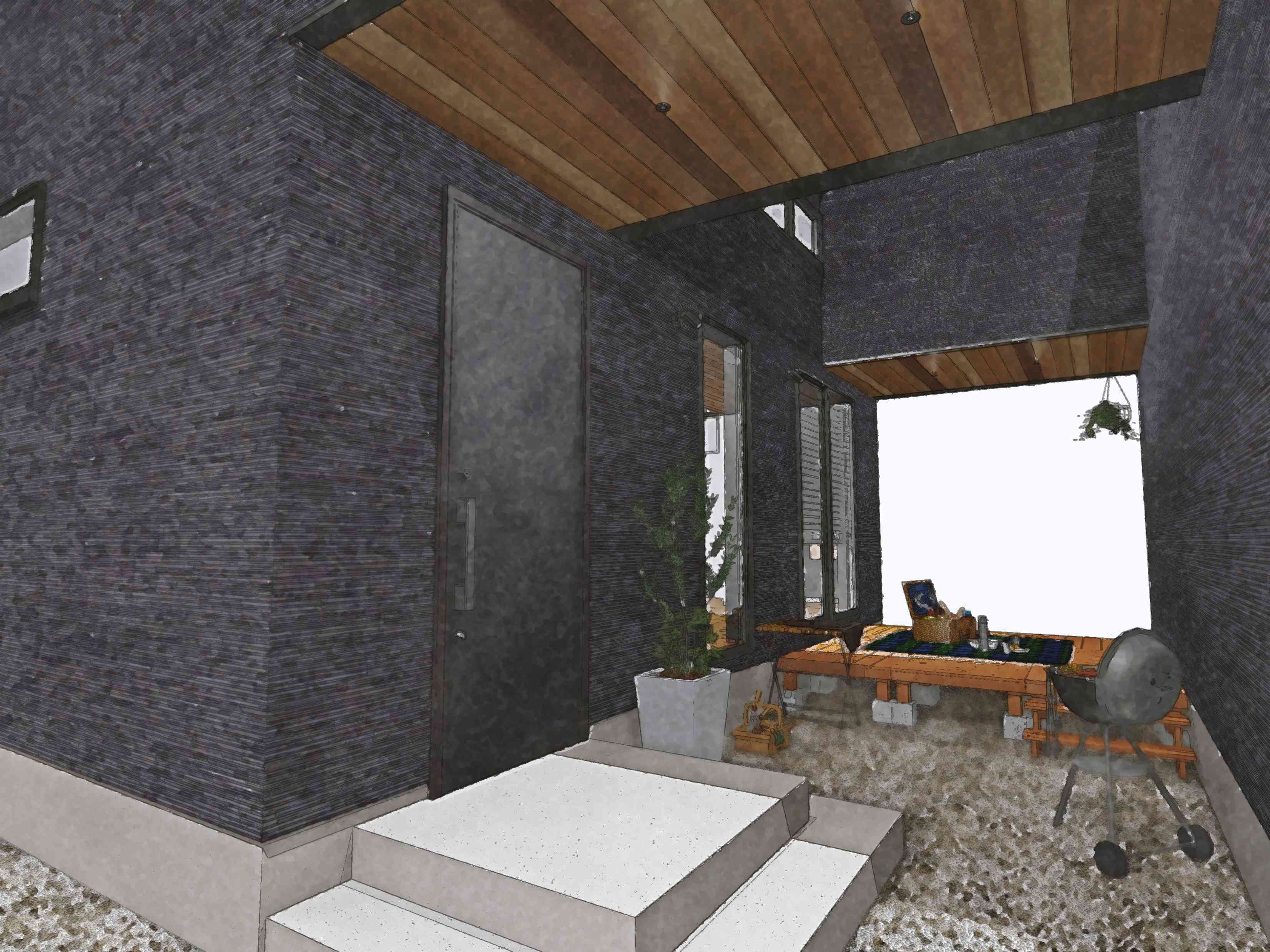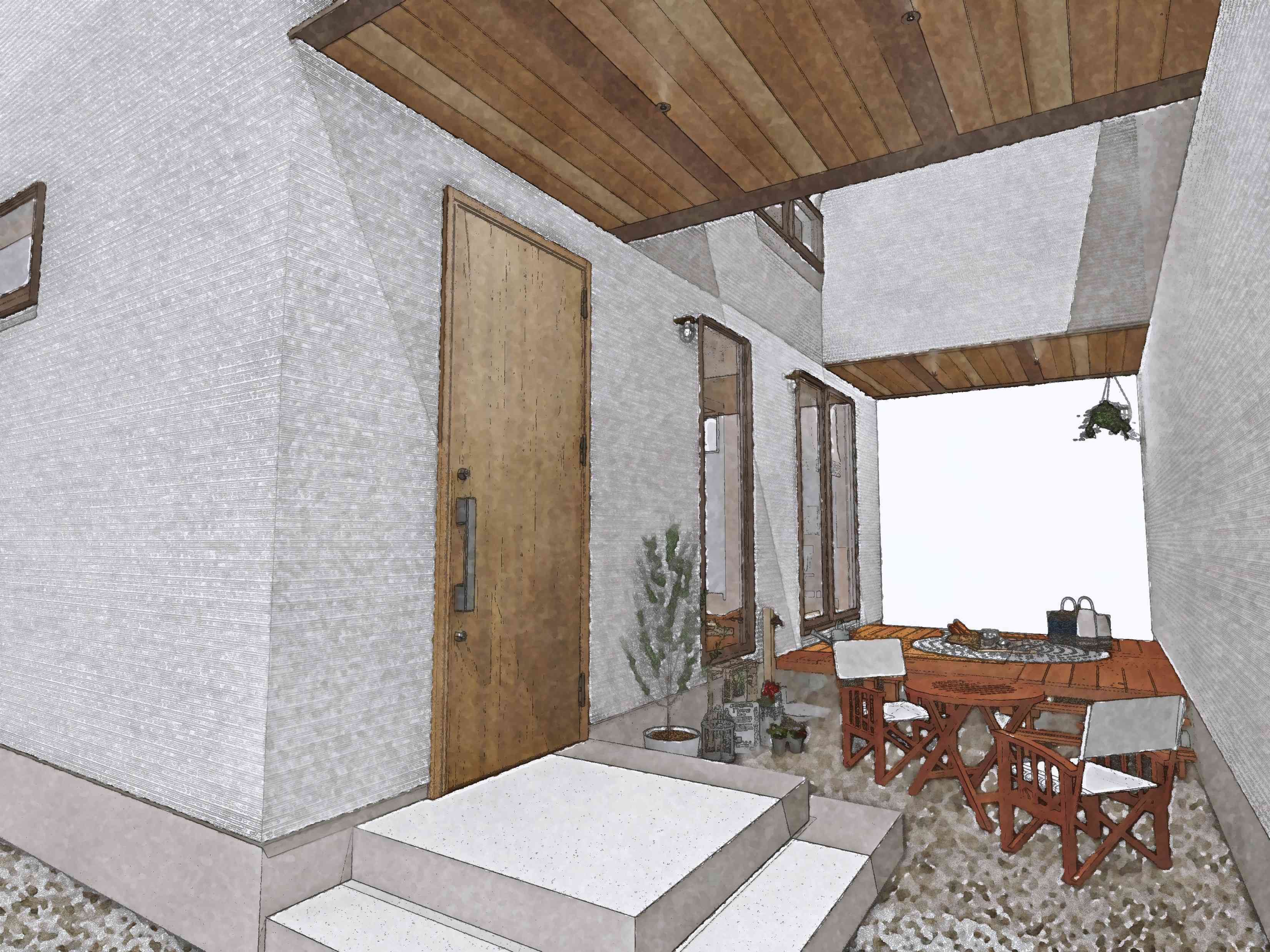 ファサードに大きな壁がたち、生活感が外から感じられない印象となります。玄関ポーチとお庭・ウッドデッキをつければ直線状で繋がり、ゲストをもてなすお庭としても活用できます。