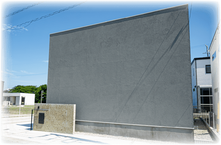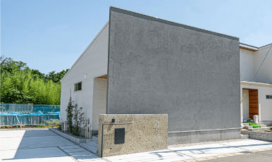 ファサードとなる大きな壁は、あくまでも住む本人達の見せたいもの、こだわる部分を大切にしたいためのアクセント。更には建物正面に視界を絶つことで、敷地外の景観は気にしなくて良い造りとなっています。