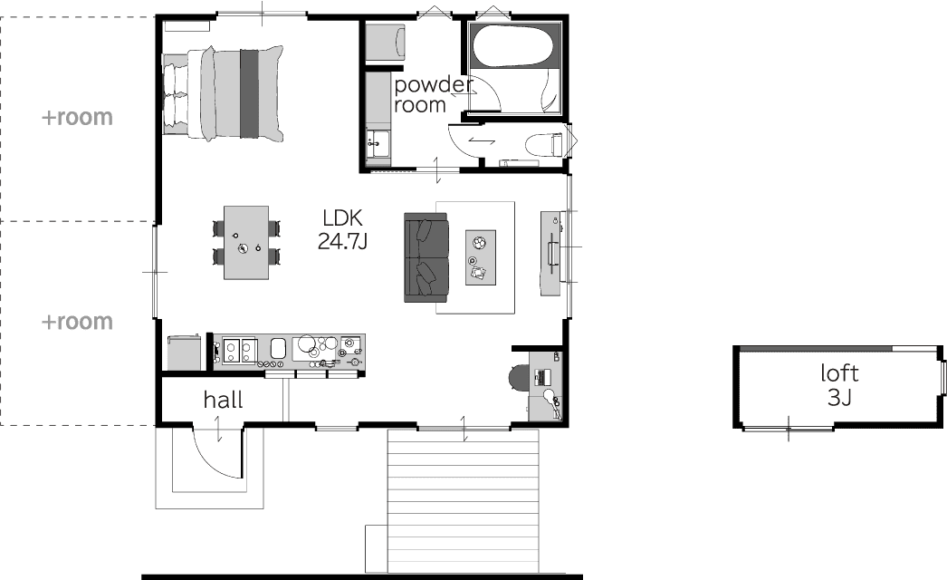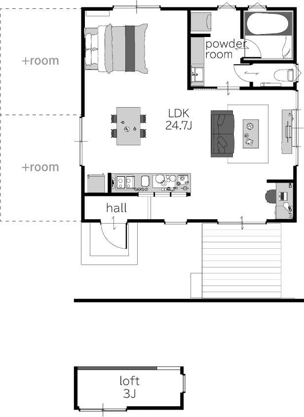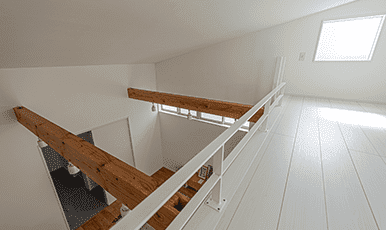 玄関とキッチンの仕切りは室内窓を設置することで、視界と明るさを繋げることを実現。ワンルームで必要最低限の間仕切りのみで構成しています。これが究極のゼロLDK。ワンルーム内の使い方は基本的にフリーでリビング下の空間は書斎や趣味の空間として活用して頂けます。またウッドデッキをつければその空間から、お庭も室内感覚で使える仕上げになっています。リビング上は勾配天井とし、ロフトも設置。このロフトは繋がりを多く持たせる位置関係を実現しています。