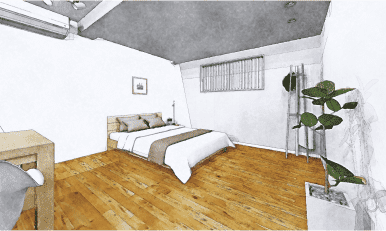6帖分のベッドスペースを用意。ベッド正面の壁はDIYで付け足す収納壁として活用いただけます。何らかのパーテーションを足す事も想定しベッド近くにエアコンを設置できるようにしました。