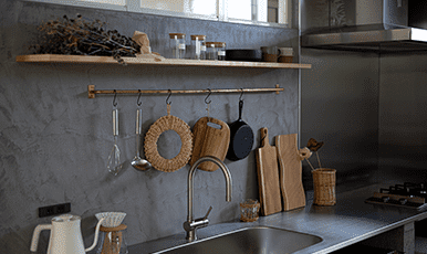 「持たない暮らし」を想定し収納は必要限のものを用意。拘りのあるものしか所有しない前提に見せる収納とする事でショップ風のディスプレイをイメージ。
